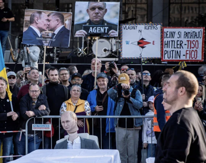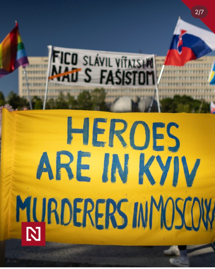 La population slovaque et l’opposition politique sont descendues dans les rues pour dénoncer une trahison et une humiliation nationale. Le slogan « Bratislava n’est pas Moscou, la Slovaquie est l’Europe » a résonné lors d’une grande manifestation organisée le 9 mai sur la place de la Liberté à Bratislava. Des milliers de personnes s’y sont rassemblées, brandissant des pancartes « Hitler avec Tiso, Poutine avec Fico. » L’ancien diplomate Metod Špaček a résumé l’indignation ambiante en déclarant : « Robert Fico est allé à Moscou pour s’incliner devant Poutine. Il y est allé pour fraterniser avec les dictateurs du monde entier. »